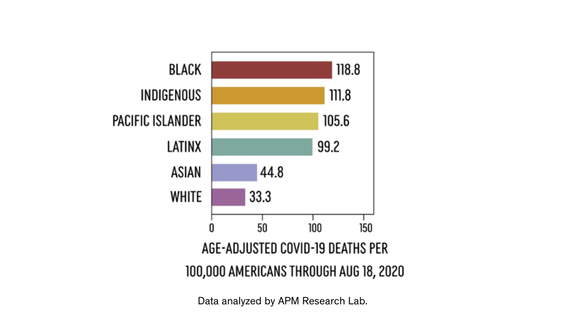 - Many more young BIPOC people are being hospitalized and dying of COVID-19 as compared to white populations, despite younger people having much less risk of severe symptoms or mortality. (Source: APM Research Lab)