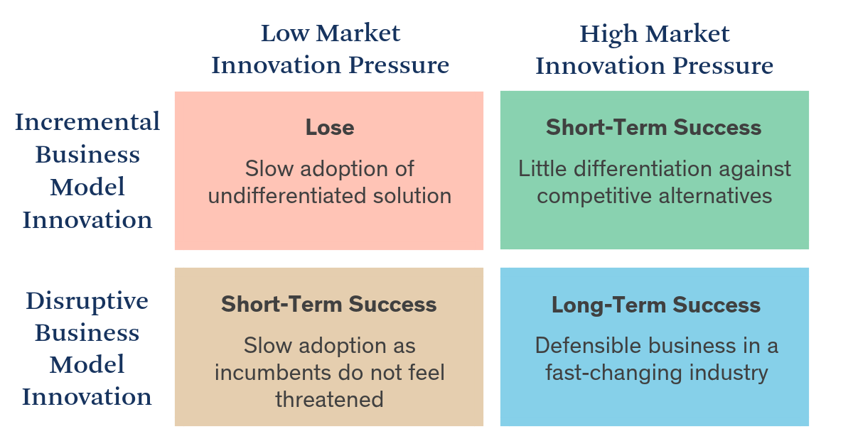 While the activity is incredibly exciting, it can also be difficult to understand where the value is ultimately captured as these industries make that 80/20 flip. When looking at companies in this space, I start with a high-level 2x2 framework of market and business innovation to help me assess the potential of these robotic companies.