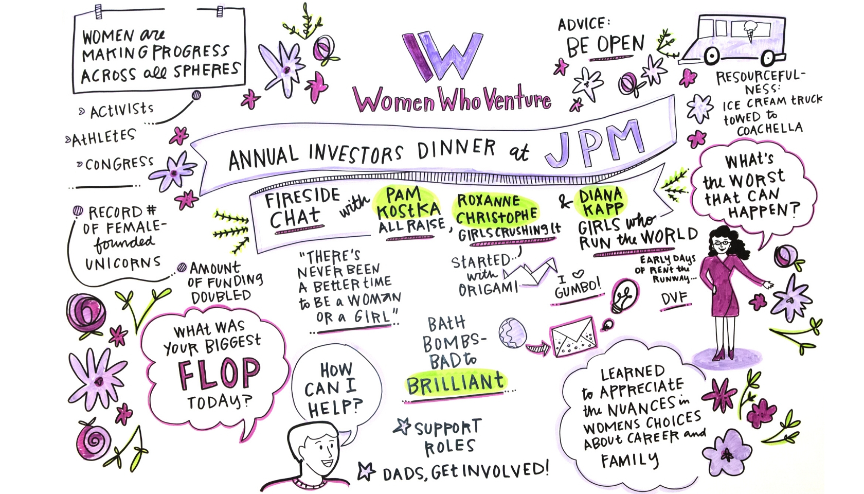 Bree Sanchez, our evening's scribe, created this visualization of the fireside conversation with Pam Kostka (founding CEO of All Raise), Roxanne Christophe (Founder and Executive Director of Girls Crushing It) and Diana Kapp (author of Girls Who Run the World: 31 CEOs Who Mean Business). Learn more about the event here.